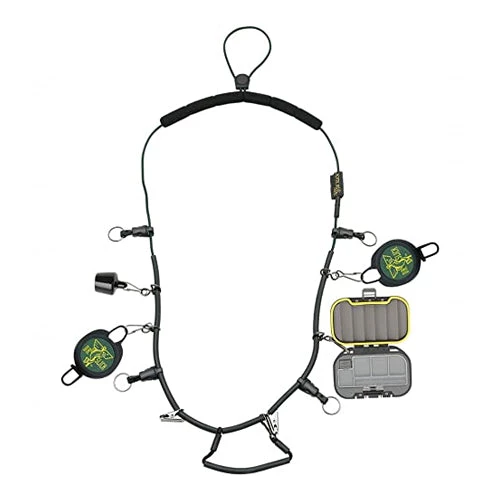Dr Slick’s loaded necklace lanyard has an elastic shock cord with a padded collar, tippet spool caddy, two RPD retractors, floatant holder, NSJO Nipper, C5G Clamp, HFG4 Hook File, Bug Jelly floatant and a waterproof fly box. Extra features include a 10 lb. break-away safety connector, compression “O” ring clips that allow portability of gear, and shirt clips to keep the necklace from swinging away from you when deep wading or bending over. Comes with all the gear you need to get going now!