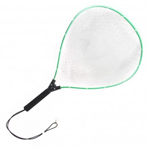 These are nice aluminum landing nets with an open teardrop shape. The rubber netting is easier on fish than nylon and improves catch and release angling.