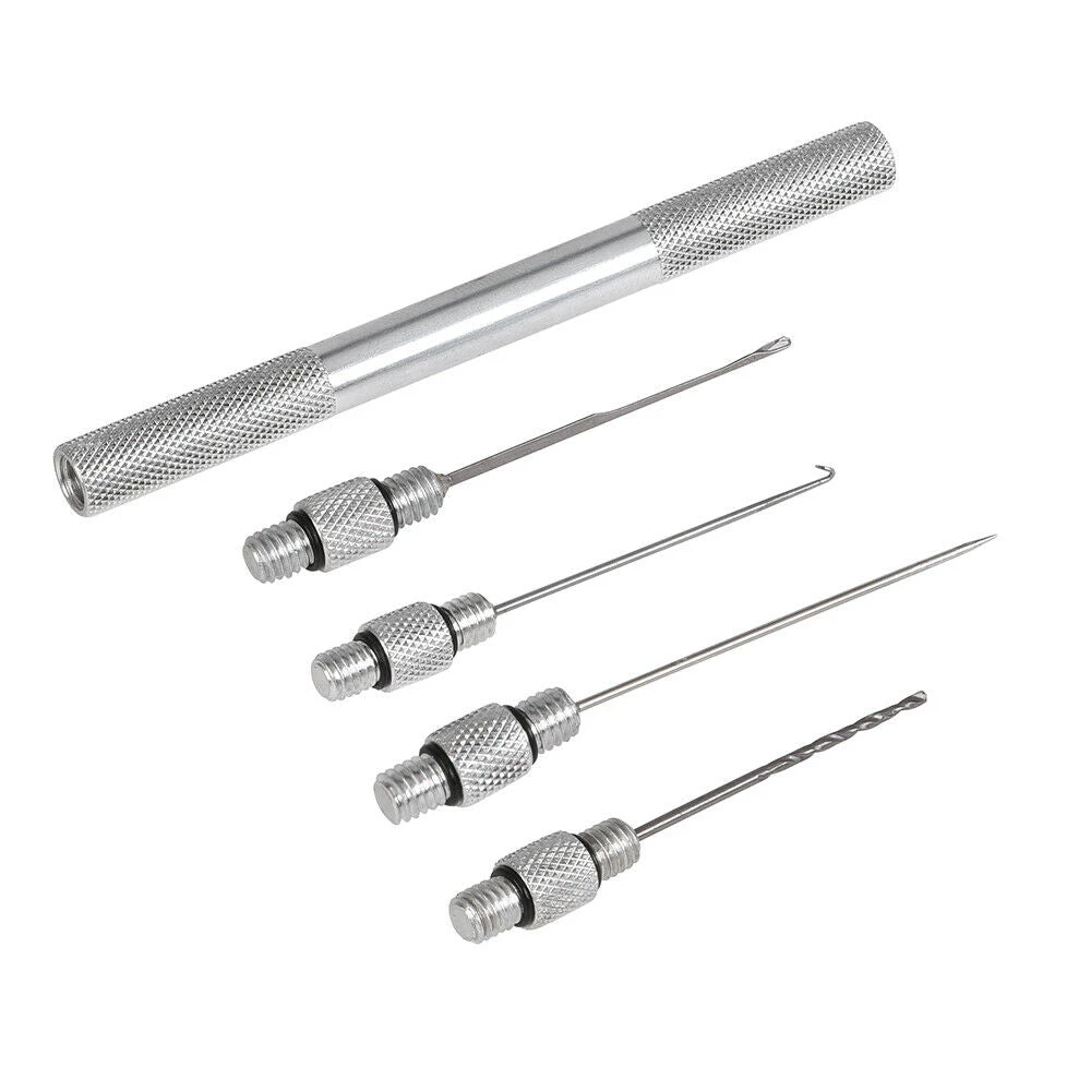 This carp fishing multi tool has several interchangeable ends. If you fish with boilies or corn you need a tool like this with a boilie drill and baiting needle.