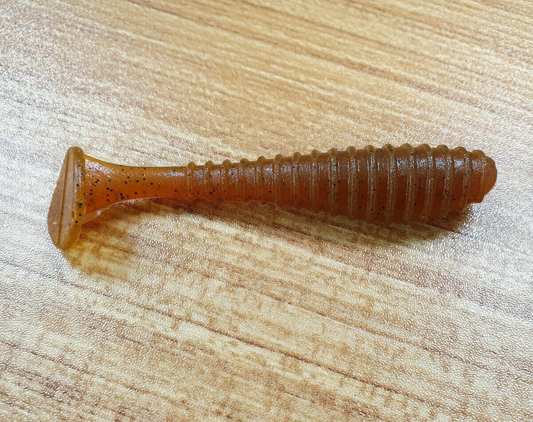 These custom poured soft plastic finesse swimbaits are designed to mimic distressed baitfish. Rings on the body create vibration and the paddle tail kicks to draw in fish from near and far. This is a great searching bait that catches everything that eats fish. Bass, walleye, pike, muskie, red drum and even big lake trout will nail these lures.