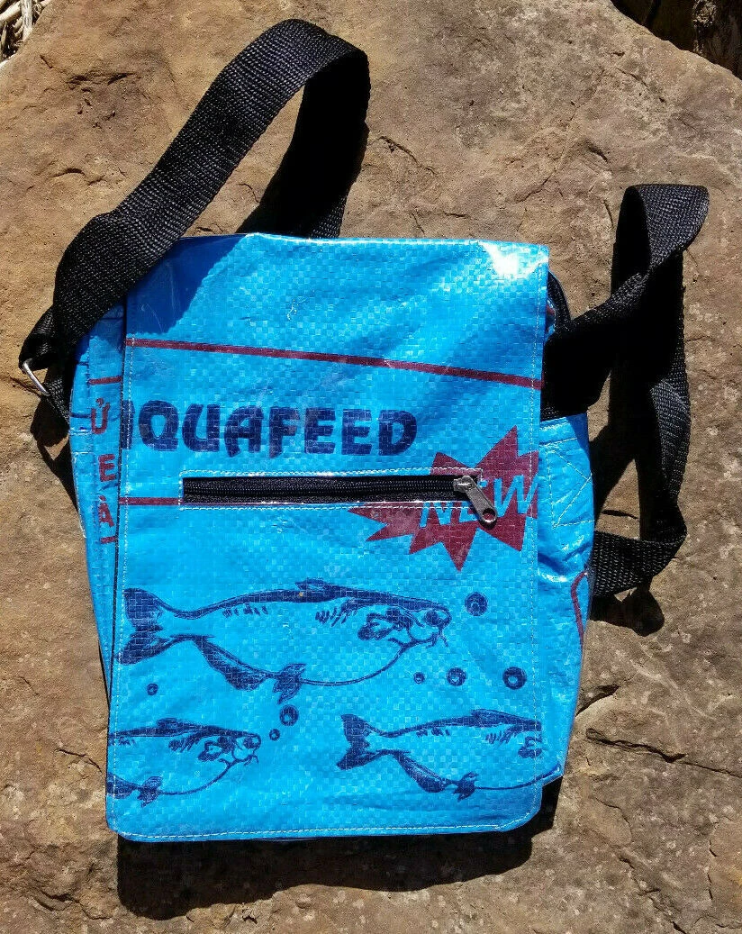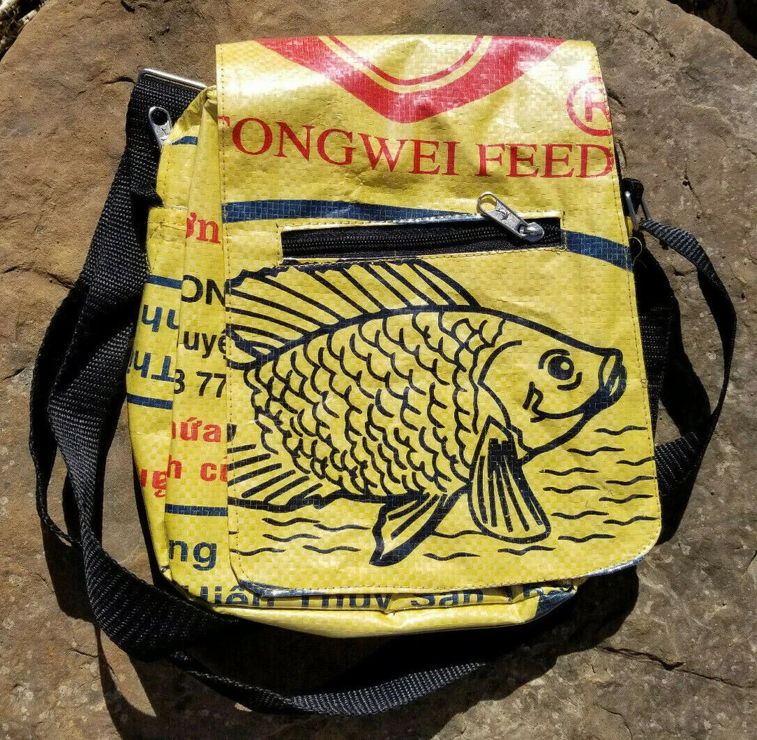 These colorful shoulder messenger style bags handmade from recycled fish feed sacks. They are water resistant and of good quality. They have many applications. You could use them for anything from a messenger bag to a shoulder bag or purse. The choice is yours.