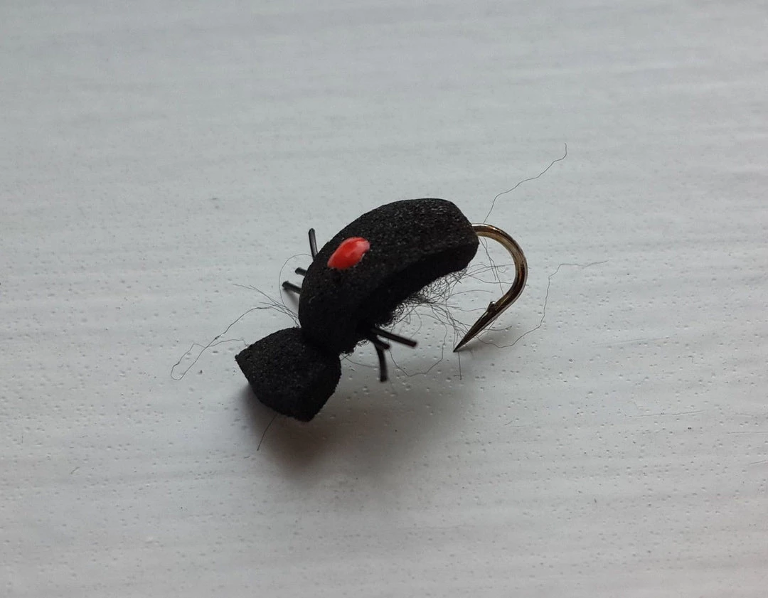 The indicator beetle is a foam fly with durable legs that works well throughout the warm months. The orange dot on its back makes the fly visible to anglers though it cannot be seen by the fish. As the name would indicate this fly is great for use as the lead in a two fly dropper combo instead of a strike indicator because when a fish hits this they can be hooked. When they hit a regular strike indicator the only thing you get is shock or disappointment.
