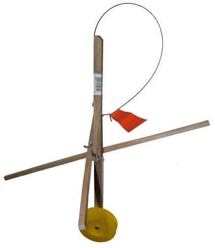 A classic style wooden tip-up that has been a best seller for years. Features include: greased tube to prevent freeze-up, hardwood frame, bright “hi-viz” flag, smooth running screw, and attached 4″ reel made of durable plastic. Excellent for Pike!
