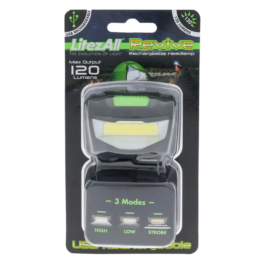 Up to 120 Lumens • Easy Push-button Operation • 3 Light Modes Including High (120 Max Lumens), Low (60 Lumens) and Strobe • Lockable Tilt Positions Up to 60 Degrees • Fully Adjustable Head Strap included Comfortably Fits Most Head Sizes • USB Rechargeable • Charging Cable Included • Measures 2.25″W x 1.75″H x 1.25″D • Rechargeable 1200mAh Battery