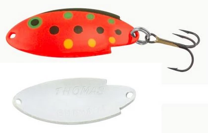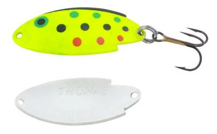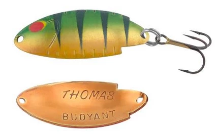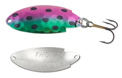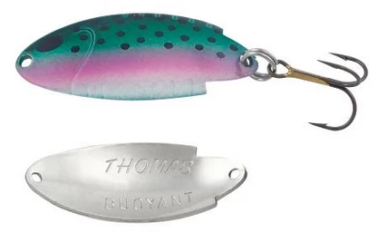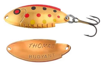 The Thomas Buoyant minnow is a deadly trout and salmon lure! First issued a U.S. patent in 1946, the Buoyant is an erratic-action wobbler that imitates the darting motion of a frantic, fleeing baitfish. This action, combined with jewelry-quality finishes, creates a spoon that entices even the wariest of trout or salmon, and many other types of game fish, into striking.